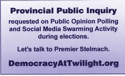 The combined effects in particular of Public Opinion Polls and Social Media Swarming Phenomena, raised to an intensity seldom seen, save in the Obama election win of 2008, bear close scrutiny by the Province of Alberta.